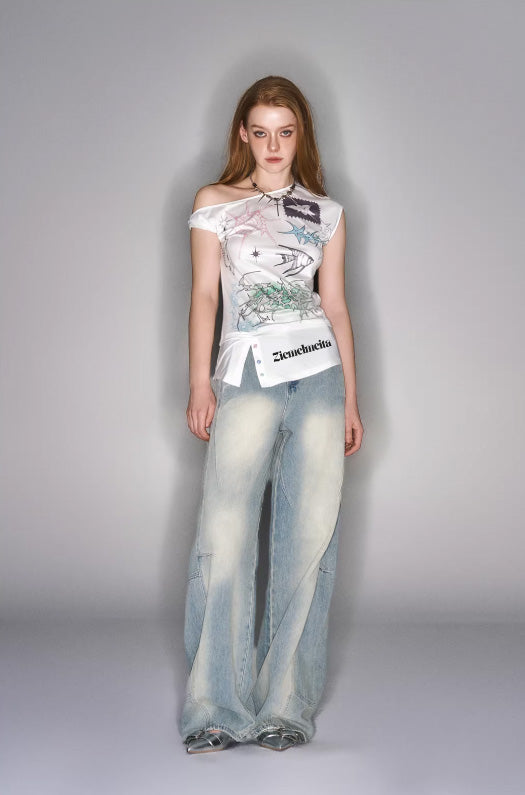This asymmetrical shoulder tee redefines minimalism through architectural imbalance. The exposed shoulder detail is not merely decorative—it introduces directional flow to the garment, breaking away from conventional symmetry while maintaining elegance. The white base enhances the structural lines, allowing the asymmetry to become the visual focal point without appearing excessive. The design is intentionally clean, ensuring it feels refined rather than overly experimental.